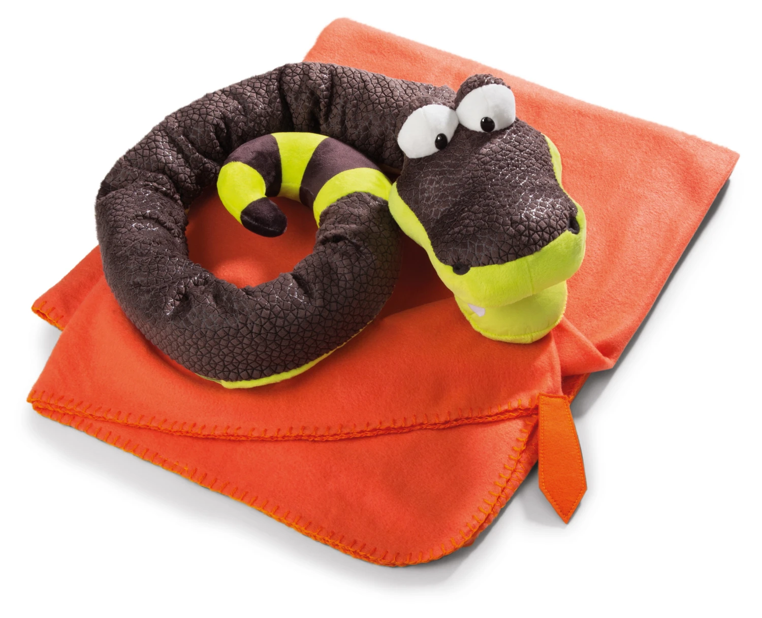 Die Fleecedecke in der Farbe orange kann zusammengerollt und im Körper von Sascha der Schlange verstaut werden.