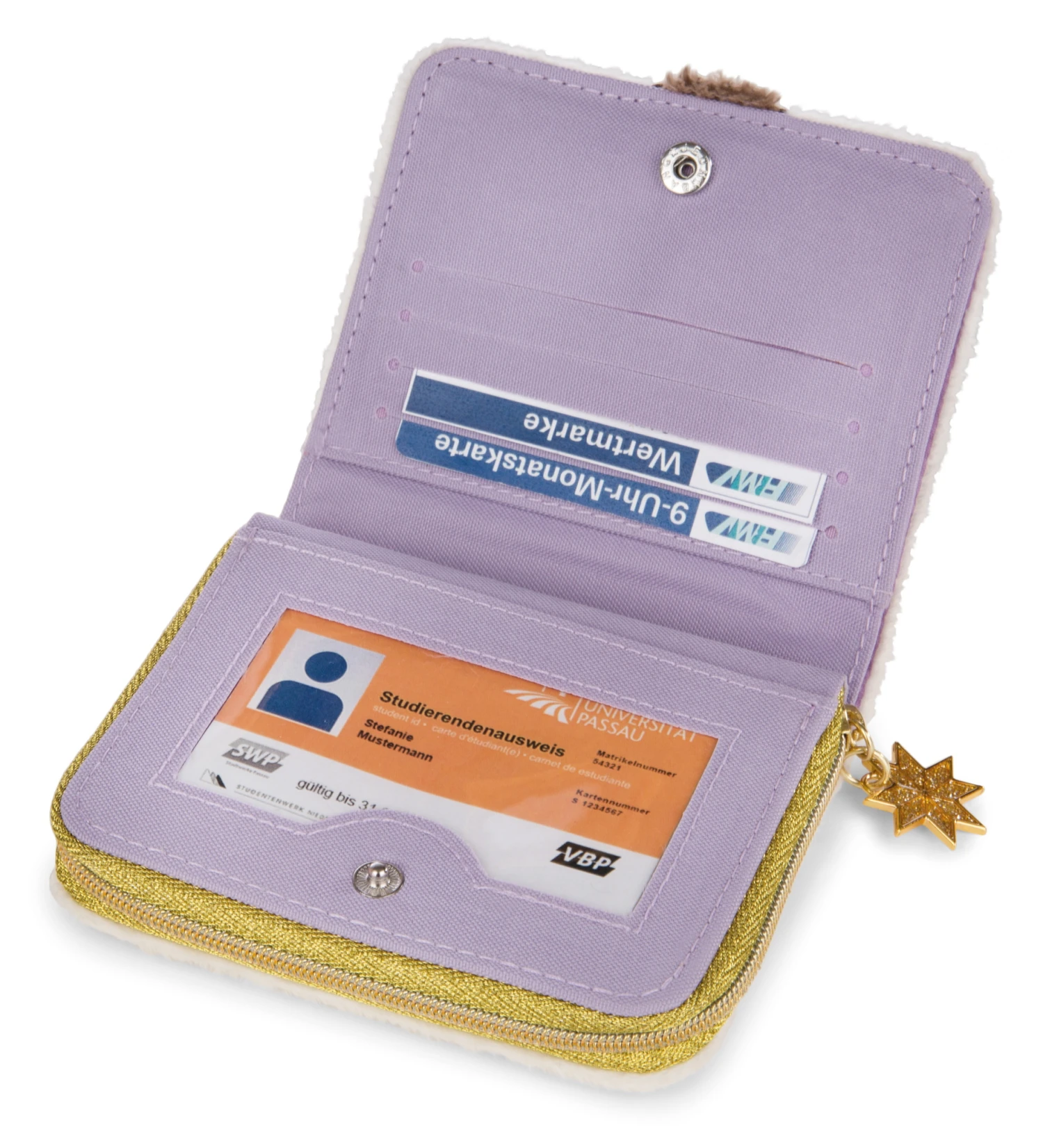 Mit Reißverschluss für das Münzfach. Mittels Druckknopf öffnet man leicht das Fach für Geldscheine sowie Platz für vier Karten