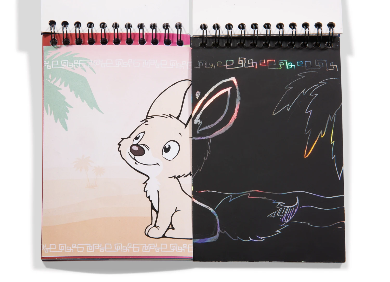 In dem Wild Friends Kratzbuch können Kinder mithilfe eines Stifts auf den 16 schwarzen Kratzseiten 16 bunte Motive rund um Ameisenbär Anita, Kamel Kemal, Gürteltier Armin und Wüstenfuchs Fehmi erscheinen lassen.
